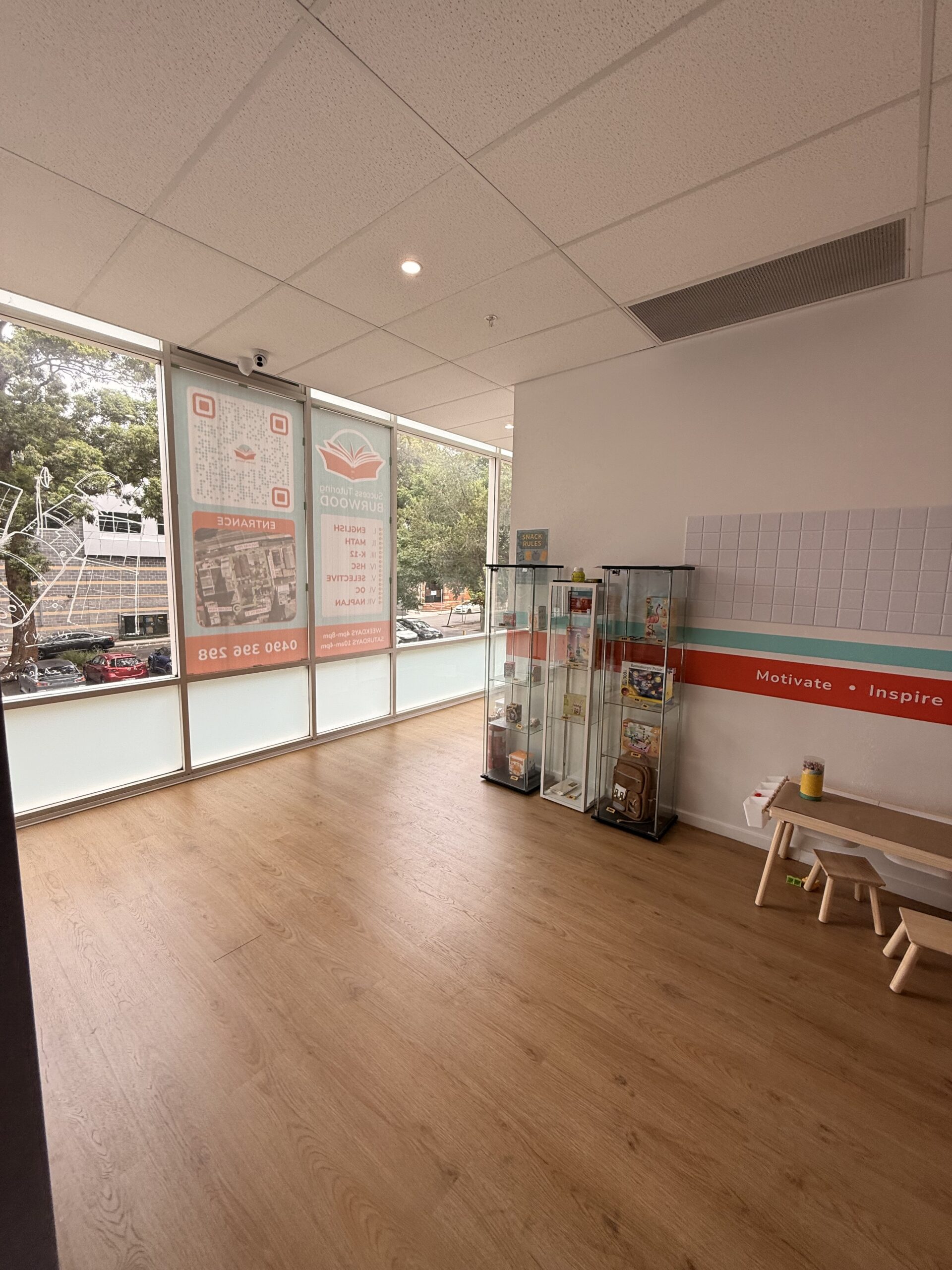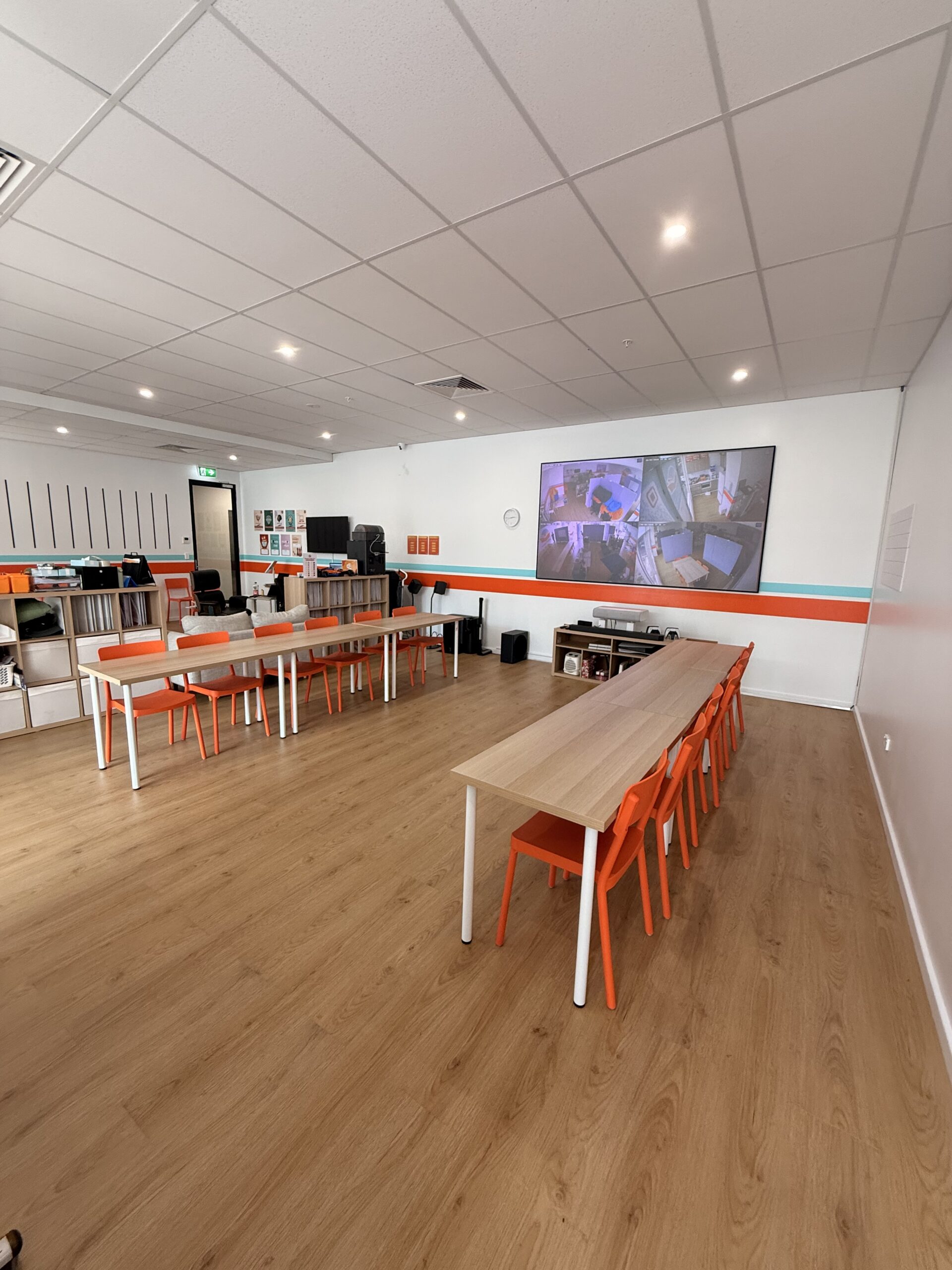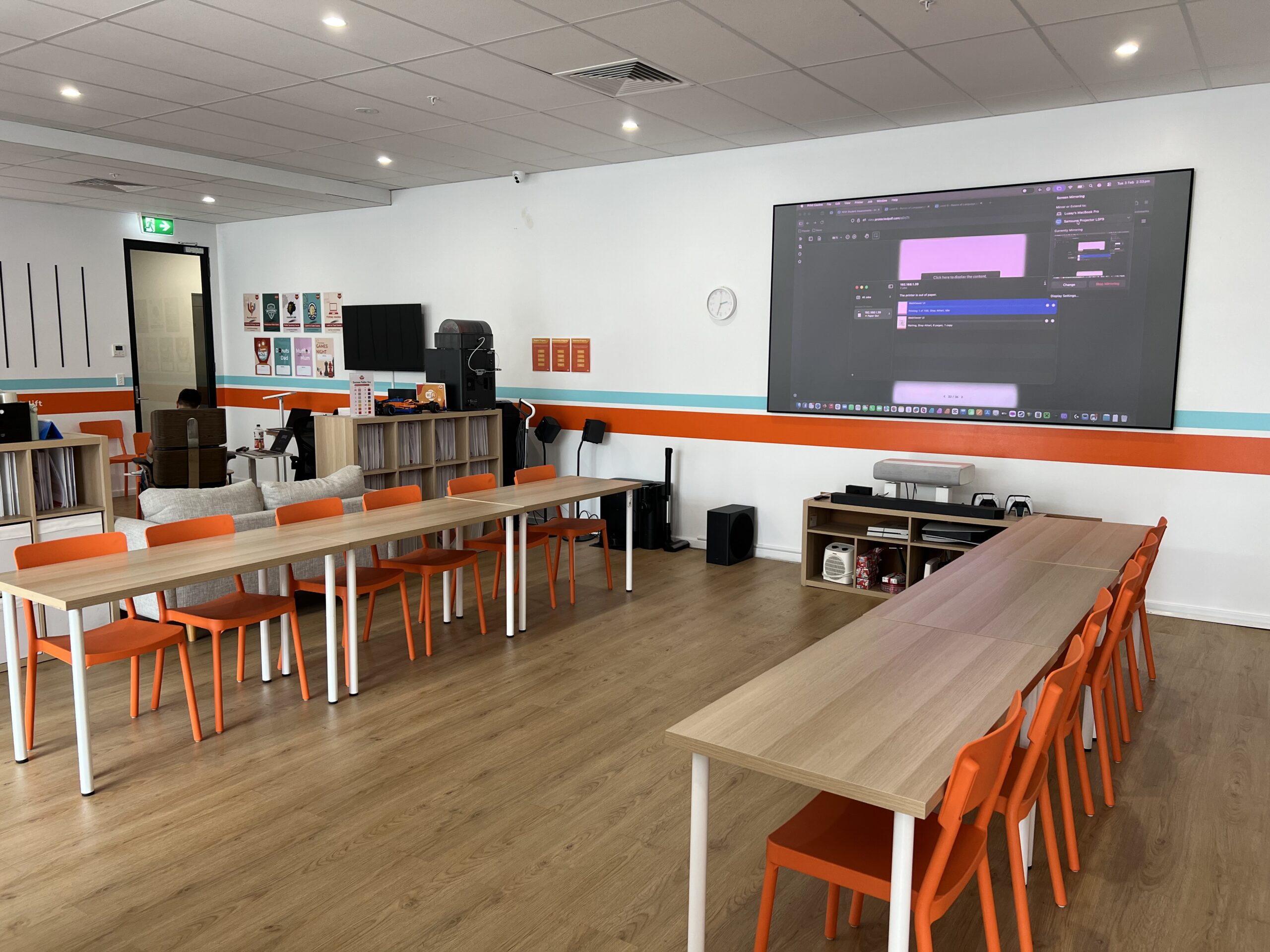 A modern, flexible learning and meeting space ideal for tutoring, workshops, small team training, and presentations. The centre features four collaborative 6-seat hubs (up to 24 seated), a large 120-inch projector screen for presentations and meetings, plus a comfortable waiting area. Includes access to a small kitchen for refreshments. Great for daytime bookings, study groups, seminars, and small business sessions.